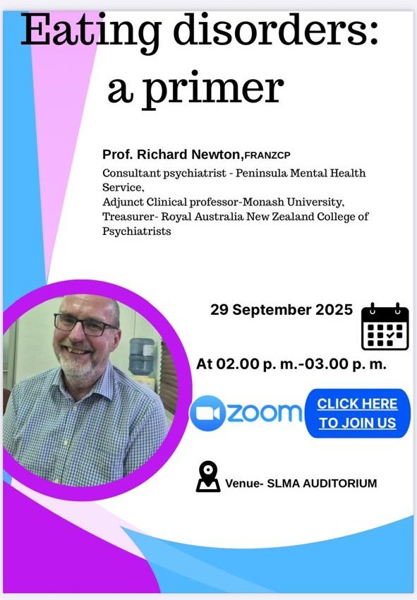 2nd CPD lecture organized by the council 2025/2026.Lecture on Eating Disorders by professor Richard Newton. He was the external examiner for MD psychiatry part 11 examination held in 2025. Lecture was conducted on hybrid mode (record is not available)