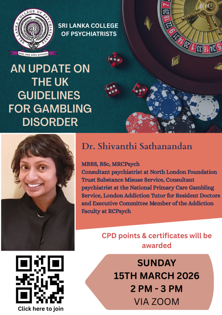Detail InformationOrganizationSri Lanka College of PsychiatristsProgrammeComprehensive Psychiatry for ERPM (Theory, MCQs & OSCEs)Duration6 weeks (Fridays & Saturdays)Starting DateJanuary 23, 2026Course FeeRs 25,000Registration DeadlineJanuary 20, 2026