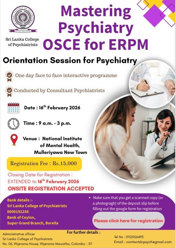 Detail InformationOrganizationSri Lanka College of PsychiatristsProgrammeComprehensive Psychiatry for ERPM (Theory, MCQs & OSCEs)Duration6 weeks (Fridays & Saturdays)Starting DateJanuary 23, 2026Course FeeRs 25,000Registration DeadlineJanuary 20, 2026