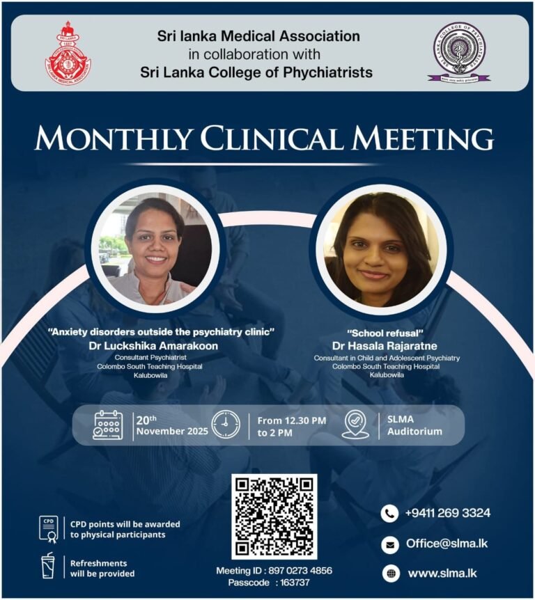 Join the upcoming Monthly Clinical Meeting organized by the Sri Lanka Medical Association in collaboration with the Sri Lanka College of Psychiatrists. Gain valuable insights from expert discussions on “Anxiety