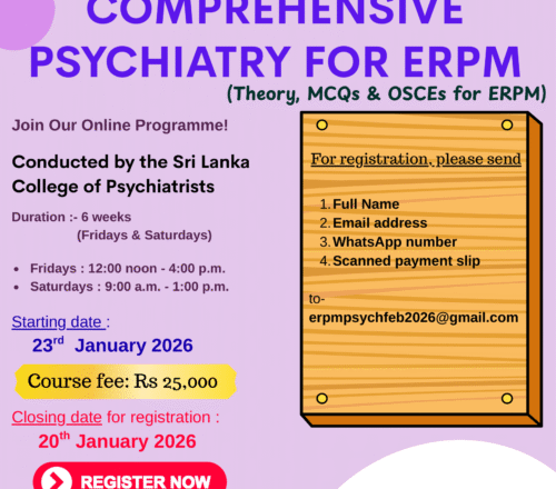 Detail InformationOrganizationSri Lanka College of PsychiatristsProgrammeComprehensive Psychiatry for ERPM (Theory, MCQs & OSCEs)Duration6 weeks (Fridays & Saturdays)Starting DateJanuary 23, 2026Course FeeRs 25,000Registration DeadlineJanuary 20, 2026